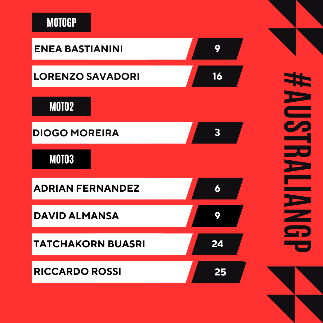 “It was a very tough race physically, I wasn't in top form, but we still managed to finish it at a good pace. Unfortunately, Saturday's accident, caused by Binder's manoeuvre, slowed down our work over the weekend, as well as hurting me physically. I'm happy for Aprilia, who had a great weekend and achieved their 300th victory. I'm very proud to be part of this project.”
